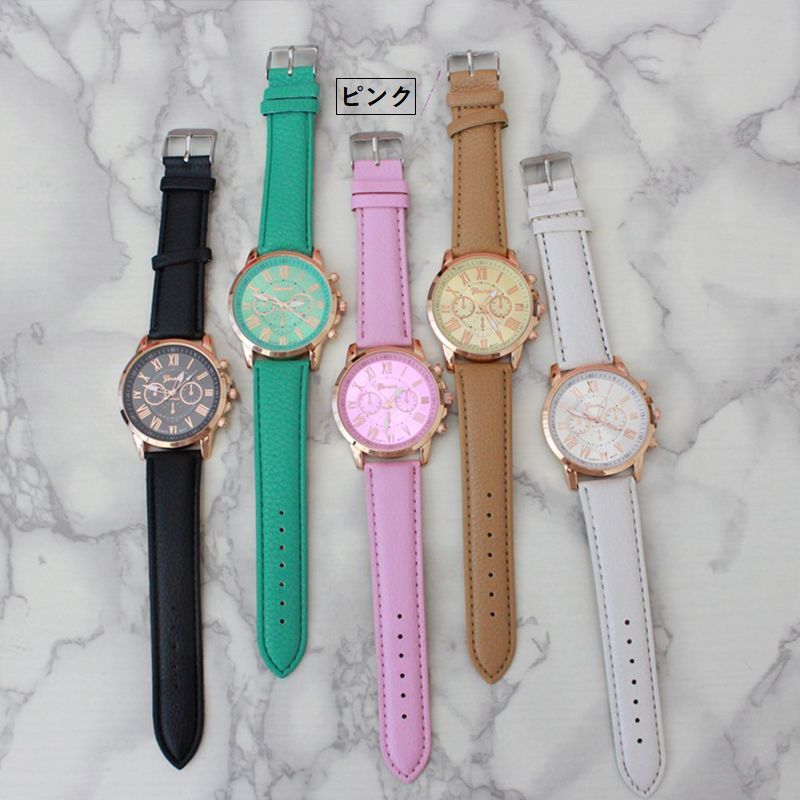 腕時計 うで時計 時計 可愛い かわいい おしゃれ オシャレ お洒落 ベルト 革ベルト 針 アナログ 文字盤 ピンクゴールド キラキラ きらきら 女性 レディース 女の子 白 黄 紫 緑 青 黒 茶 ホワイト イエロー パープル グリーン ブルー ブラッ